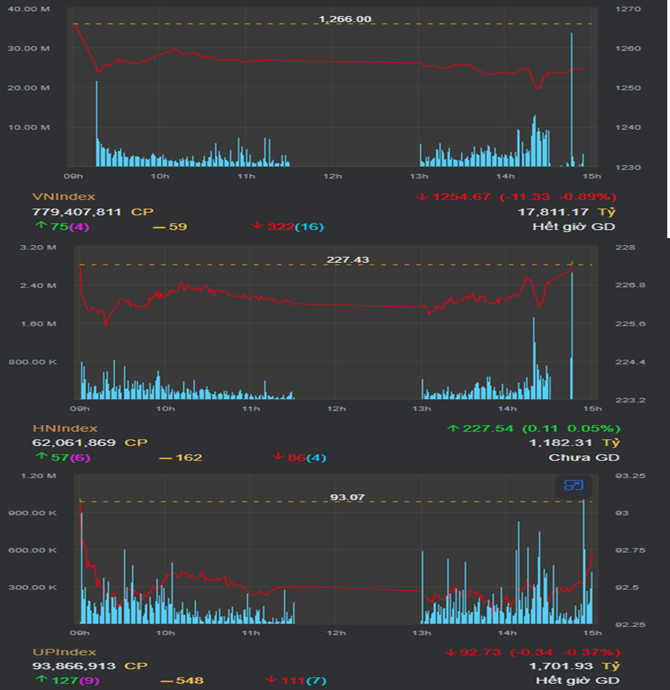 – Đóng cửa 1254,67 giảm 11,33 điểm so với phiên trước.