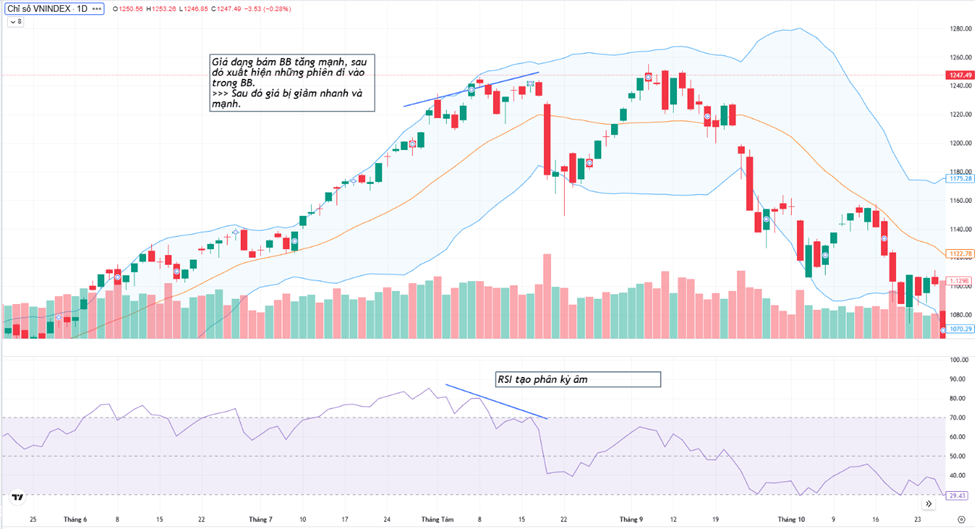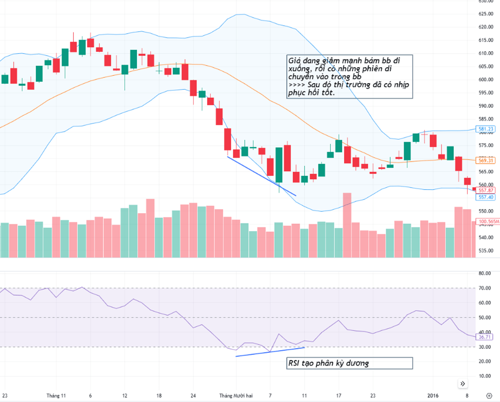 - Khi giá đang có một xu hướng manh bám BB tăng lên (hoặc giảm xuống), sau đó có những phiên giá vận động đi vào bên trong của BB (với những cây nến thân nhỏ tín hiệu càng tin cậy).