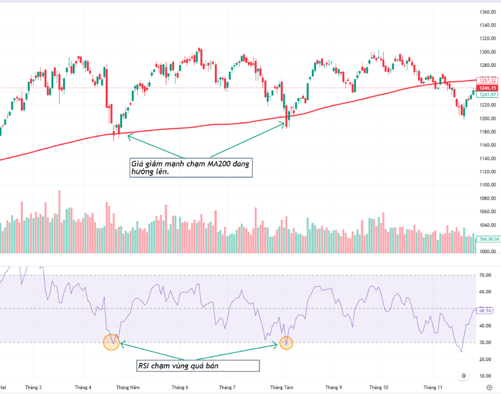 Ví dụ: Khi giá giảm mạnh, RSI chạm 30 (tín hiệu quá bán), đồng thời giá gặp MA200 đang dốc lên. Chúng ta có mua vào ở đây.