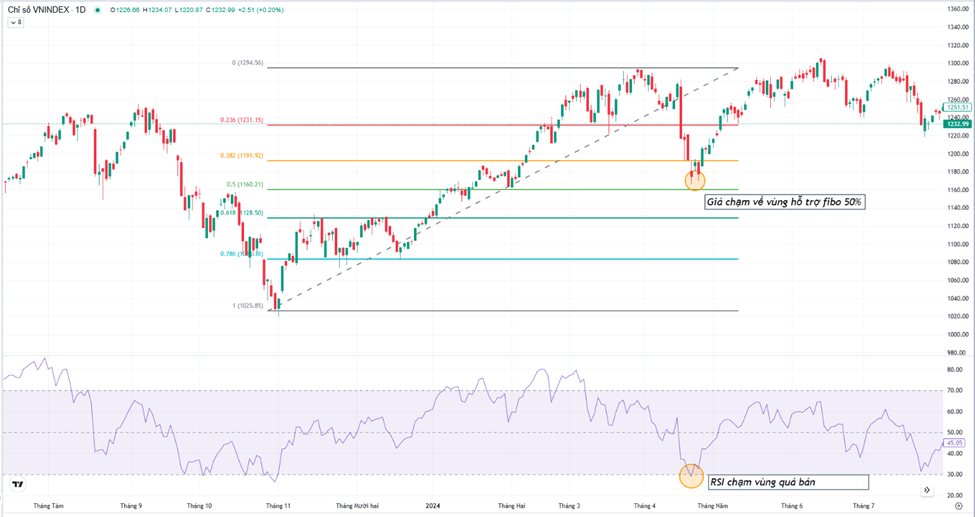 Ví dụ: Khi giá điều chỉnh về vùng fibo 50%, RSI về vùng quá bán. Thị trường đã tạo đáy và bật lên rất mạnh.