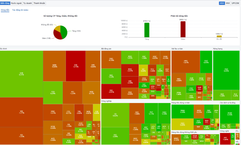 Thanh khoản toàn thị trườn đạt 24653.82 tỷ đồng, cải thiện nhẹ so với phiên hôm trước. Tuy nhiên nước ngoài bán khá mạnh ở mức 1238.89 tỷ đồng, lớn hơn rất nhiều so với những phiên trước đó trong tuần (chỉ quanh mức 300-400 tỷ đồng). Độ rộng thị trường là khá cân bằng, khi số mã tăng và mã giảm không chênh lệch quá nhiều, tương tự với giá trị mua chủ động và bán chủ động.