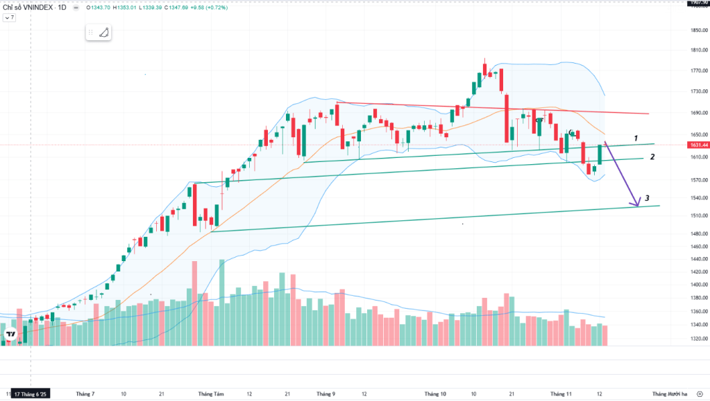 Mốc 1: Tích cực nhất: VNINDEX không thủng 1630 và có thể bật lên phía trên vùng 1650-1660 (vượt ma20) trong những phiên tới. Điều này củng cố cho kết luận phiên thủng 10/11 là nhịp rũ bỏ. Việc tích lũy ở phía trên 1630 lúc này với vol thấp cũng không đáng ngại.