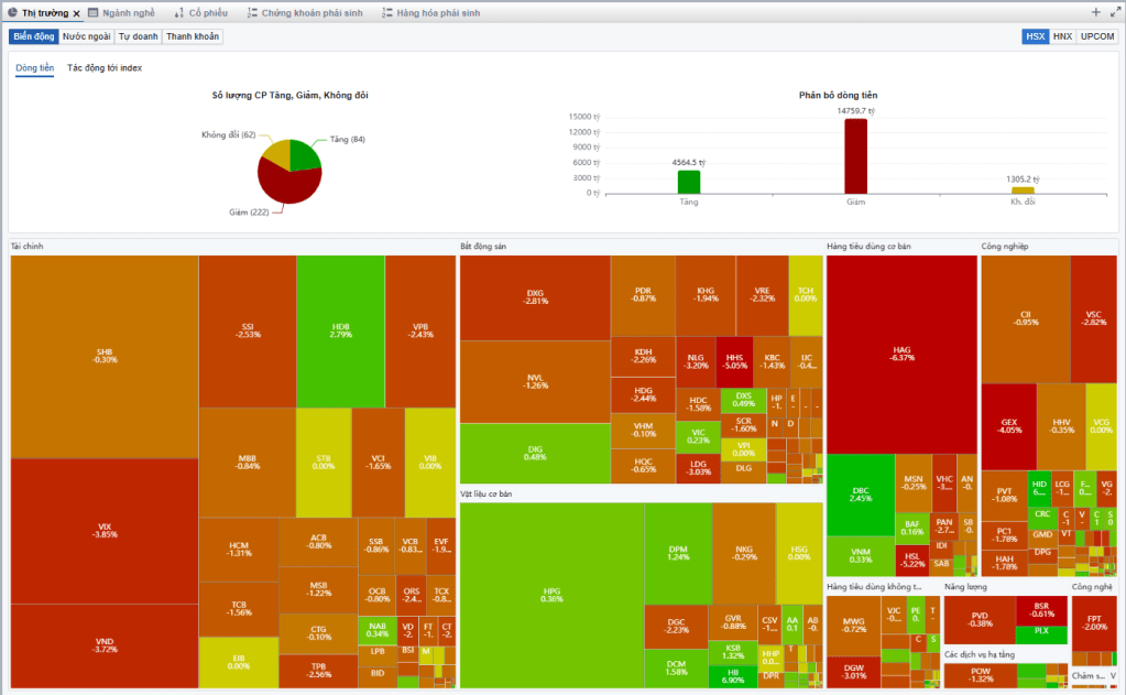 Thanh khoản thị trường ở mức 26698 tỷ đồng, tăng 7% so với phiên trước đó là phiên thanh khoản tăng thứ 4 liên tiếp. Tuy nhiên đáng tiếc là đến ở một phiên giảm điểm của thị trường. Khối ngoại quay lại bán ròng mạnh với giá trị hơn 700 nghìn tỷ đồng. Độ rộng thị trường nghiên hoàn toàn về bên bán với số mã tăng/giảm lần lượt là 84/222, dòng tiền mua chủ động ở mức 4564 tỷ đồng trong khi giá trị bán chủ động lên đến 14759 tỷ đồng.