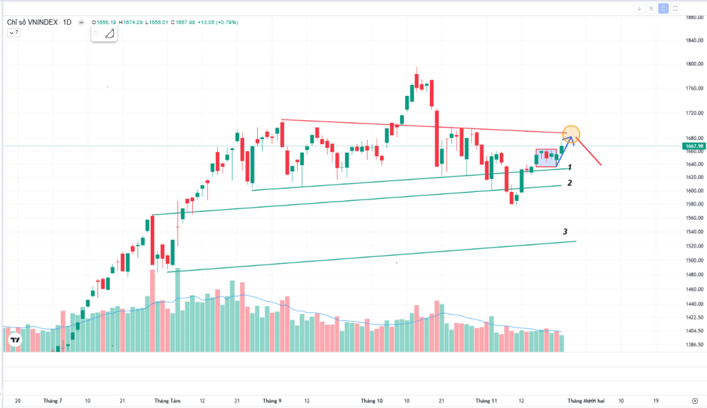 Như bài phân tích ngày 24/11/2025, chúng ta có dự đoán thị trường sẽ có điều chỉnh khi tiếp cận vùng kháng cự mạnh 1680-1700, và hôm nay VNINDEX mở cửa gap tăng mạnh tiếp cận gần 1680, và sau đó áp lực bán trên thị trường lớn khiến thị trường điều chỉnh. VNINDEX đóng nến tạo cặp nến Bulish piercing với thanh khoản lớn, đây là nến cho tín hiệu đảo chiều, có thể nhịp phục hồi của thị trường sẽ kết thúc ở 1680.